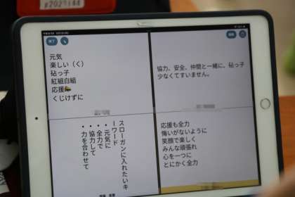6年生の様子です。金曜日に代表委員会から依頼のあった、運動会のスローガンにしたいキーワードを話し合っています。それぞれ土日に考えたことを持ち寄り話し合いが始まりました。
