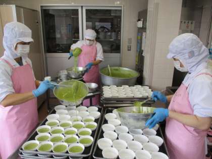 お茶は日本の家庭で伝統的に飲まれてきました。日本では「せん茶」が多く飲まれています。明日は八十八夜です。新茶の季節に合わせて、抹茶を使ったデザートを手作りしました。中には甘納豆を入れてあります。「とってもおいしかったです」という子や、「抹茶は苦手なんです・・・」という子もいて色々な感想を聞くことができました。給食を通して様々な味の体験をしてもらえたらと思います。