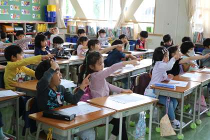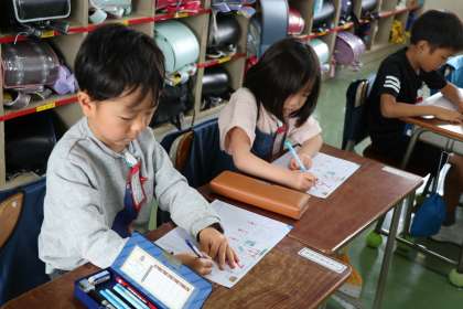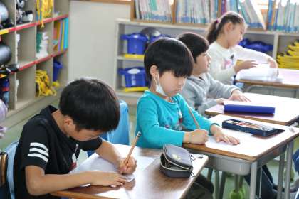 1年生国語「ひらがな」の学習の様子です。今日は「る」です。先生とみんなで書き順やコツを確認してからプリントに取り組みます。なぞったり、手本を見ながら書いたり、集中して真剣に取り組んでいます。