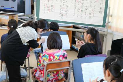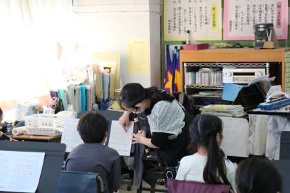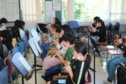 5年生の音楽の授業の様子です。リコーダーで「小さな約束」という曲を練習をしていました。短調から長調に切り替わる際の曲調を意識するのが難しいようでした。どんなふうに演奏したらいいか考えなら練習をしていました。