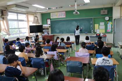 1・2・3年生には副校長先生が「3つのだいすき」のお話をしました。担任の先生がお話を聞きながら黒板に文字にしてくれている様子です。耳で放送のお話を聞き、目で黒板の文字を確認しながらしっかり聞いている1年生の様子です。