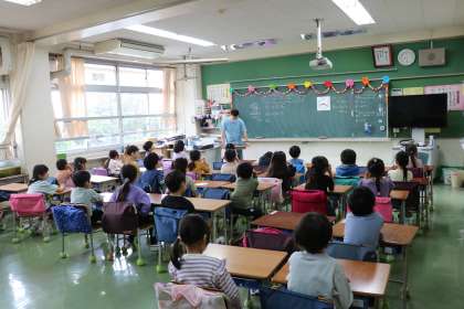 月曜日は全校朝会の日ですが、今日は4・5・6年生高学年が体育館で朝会を、1・2・3年生は放送で朝会をやりました。