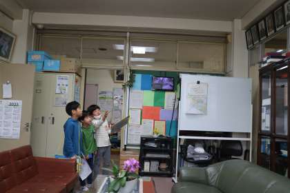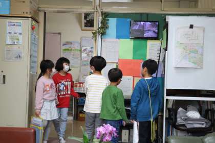 防犯カメラの映像がリアルタイムで見られるテレビを説明している2年生が可愛いです。