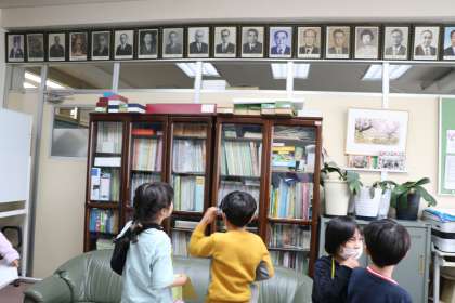 防犯カメラの次に子どもたちの興味を引いているのが、歴代校長の写真です。