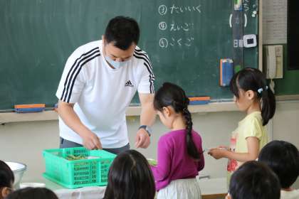 今日は1年生全員が、「グリーンピースのさやむき体験」をしました。まず栄養士の先生からグリーンピースについての話があり、さやむき開始です。これは生活科の学習の一環であり、給食調理のお手伝いでもあるのです。
