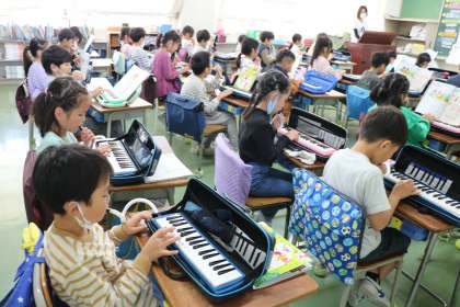 2年生音楽の様子です。鍵盤ハーモニカの上手な合奏が聞こえてきたのでずっと聞いてしまいました。先生のすてきな電子ピアノの伴奏や、友だちの音を聞きながら演奏していて、クラスみんなの息がぴったり合った演奏になっていました。