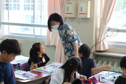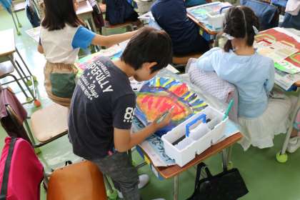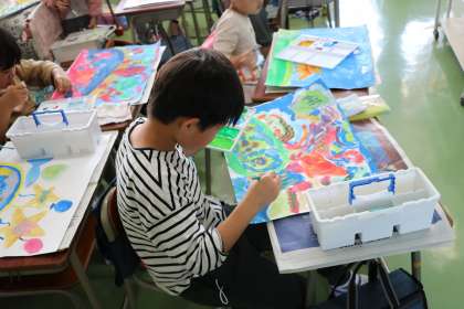 2年生の図工の授業の様子です。「えのぐじま」というテーマで絵を描いていました。島を上から下から横から見た様子を自分なりに工夫して描いていました。大きな筆を大胆に使ってカラフルな絵に仕上がっていました。