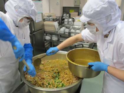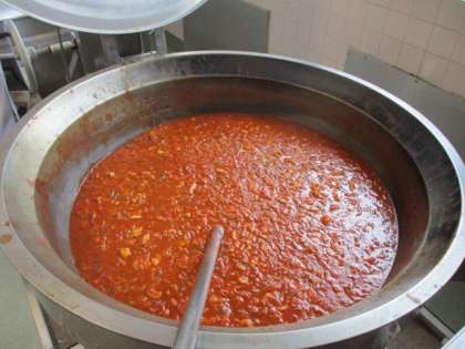 給食室で1時間以上煮込んで作ったトマトソースはとってもおいしくできました。
