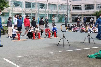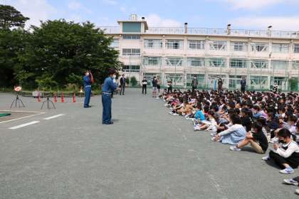 全員の避難が完了しました。家事のときの避難について、お話を聞き、その後初期消火の様子も見せていただきました。本物の消火器には薬剤が入っていること、小学生は実際に消火器を使うより大きな声で「火事だー!!」と叫び大人に伝えること、消火器は校舎の中はもちろん通学路にもおいてあることなどを教わりました。