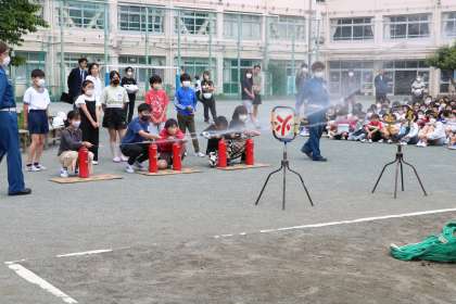 今日は、水が入っている消火器で、5・6年生代表児童が消火訓練の体験をしました。
