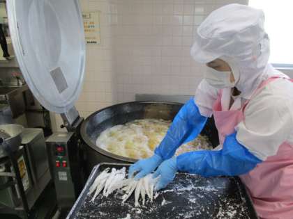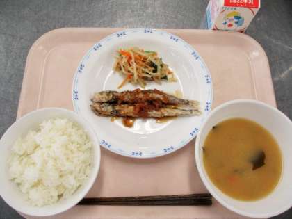南蛮漬けは片栗粉をまぶして、油で揚げたししゃもの上に、ねぎ、酢、さとう、しょうゆ、水、一味唐辛子を合わせて煮立たせて作ったたれをかけてあります。おいしくて成長期に必要なカルシウムがしっかりとれるおすすめメニューです。