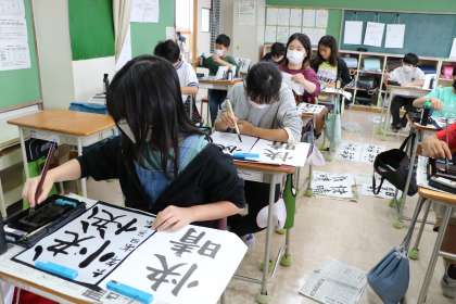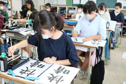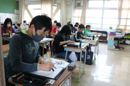 6年生書写の様子です。「筆順に気を付けながら書く」というねらいで集中してがんばっている6年生に余計なことを言ってしまいました。大きく筆で書いているので、逆さからそれを見ていたので・・・といいわけです。つい筆順違いを聞いてしまいました。でも6年生はちゃんとわかっていました正解です!