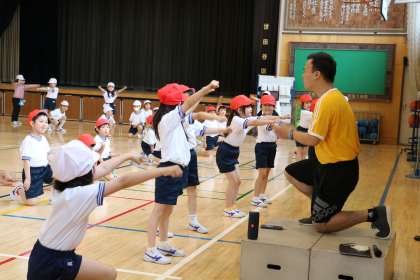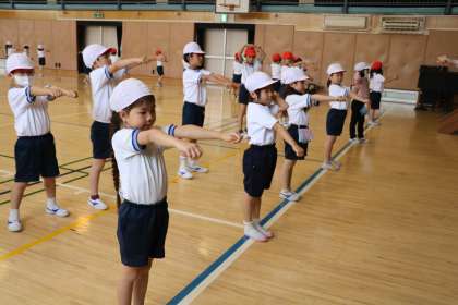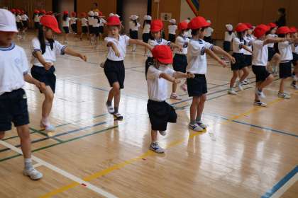 1年生も初めての運動会に向けてがんばっています、全員で円を作ったり、互い違いに動いたり等、先生の話を一生懸命聞いて隊形移動も上手にできるようになっています。