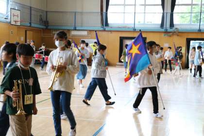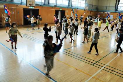 首から下げているカードは自分のポジションです。自分のポイントまで移動し、前後左右見ながら列を合わせ、メジャーのリズムを見ながら演奏の手は止めません。