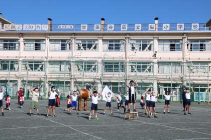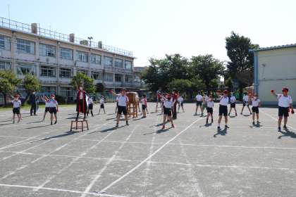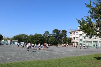 朝から気持ちのよい青空が広がっています。応援団の朝練習が始まりました。8時前と言う早朝なので、太鼓の音は控えめにしますが、応援団の気持ちの入った声が校庭に響いています。