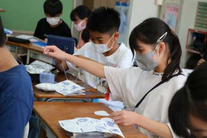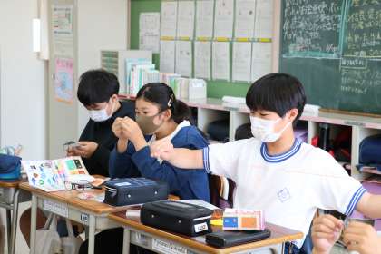 6年生家庭科・裁縫の様子です。フェルトのマスコットを作っています。