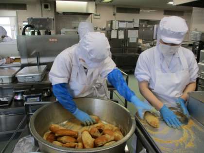 きなこ揚げパンはとても人気があります。今日も朝から「今日は揚げパンだ〜」と話しているこどもたちがたくさんいました。揚げパンは給食室のおおきな釜で揚げて作っています。きなこと砂糖を合わせたものをひとつひとつまぶしてから教室に届けます。約600個近くのパンを揚げるのは1時間以上かかりますが、みんなの喜ぶ顔を思い浮かべながら揚げていました。