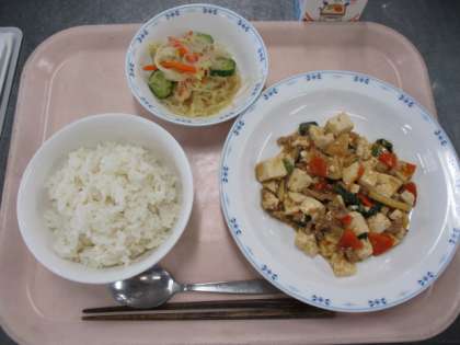 ジャージャンドウフとは、「家庭でつくられる豆腐料理」という意味で、中国四川省の料理です。四川料理といえば、辛いイメージがありますが、給食では、すこしぴりっとするかな?くらいの辛さに調節しています。1年生のこどもたちからもおいしいです!と感想をもらいました。