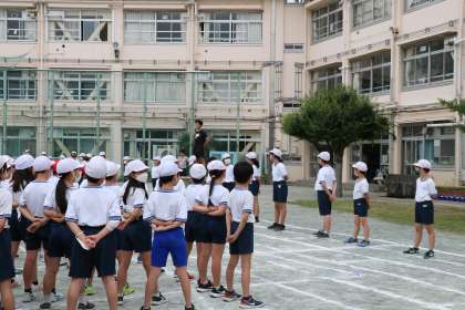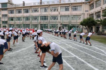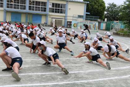 体育朝会では、運動する前にけがをしないように、また存分に力が発揮できるようにストレッチを教わりました。どの部分をストレッチしているのか、きちんと意識しながらやることが大切です。