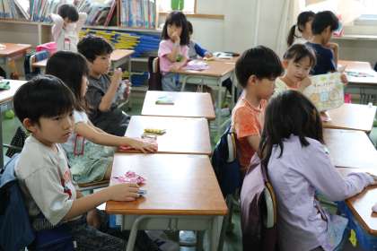 1年生朝の会の様子です。朝の会のときに必ず、ハンカチちり紙チェックをするクラスもあります。大きくなると係や委員会の子たちがするクラスもありますが、1年生なので日直さんが声をかけて毎日みんなで確認します。