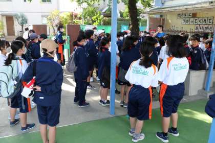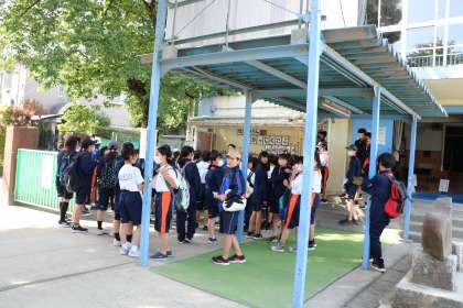 写真は、朝集合してから副校長先生に仕事の指示を出してもらっているところです。