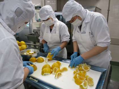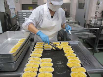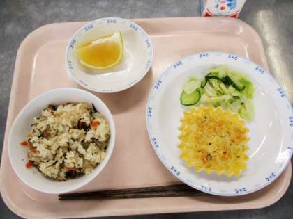 擬製豆腐は、「とうふに似せた卵料理」です。崩した豆腐と、鶏挽肉、たけのこ、にんじん、干ししいたけ、を炒めた具に溶いた卵をまぜてオーブンで焼きました。今日の果物は愛知県産の河内晩柑です。特別栽培でつくられたものです。香りがよくてとても甘いみかんでした。