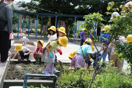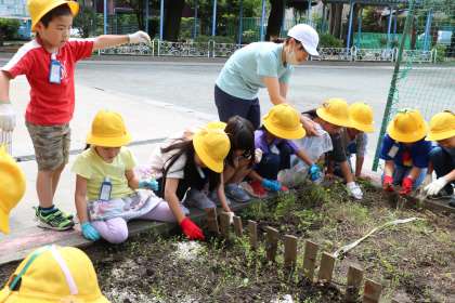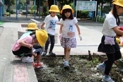 1年生生活科の様子です。歯科検診と同時進行のため、交代で学年花壇の雑草抜きをしています。