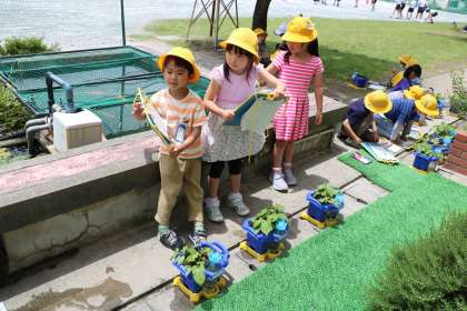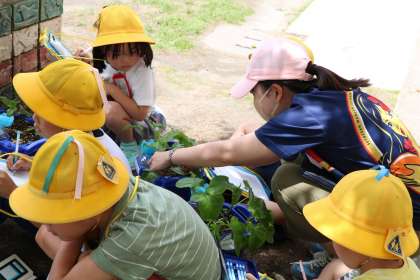 1年生がアサガオの観察をしています。