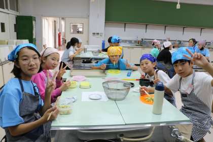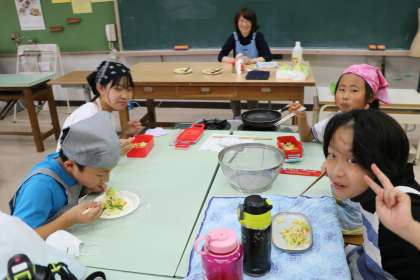 キャベツ、ピーマン、ニンジンを班で協力して洗ったり切ったり下準備をしてから炒めます。塩味もちょうどよく美味しくできたそうです。