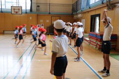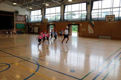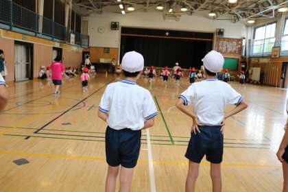 1・6年生体育の様子です。6年生に教わりながら「体力テスト」のシャトルランに挑戦しています。