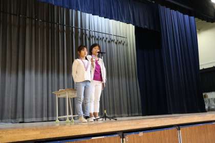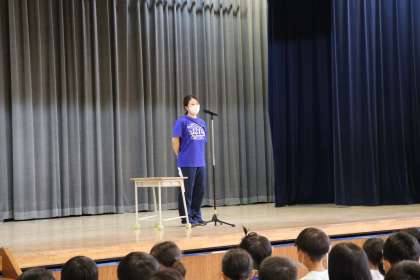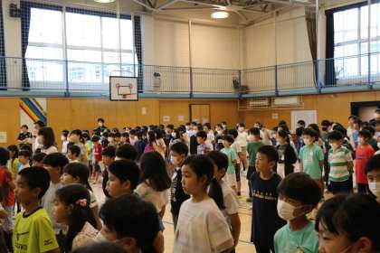 学校の外で頑張った報告、今日は水泳で優勝した3年生です。最後看護当番の先生の話まで、しっかり聞いていました。