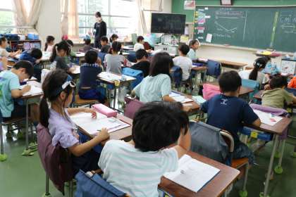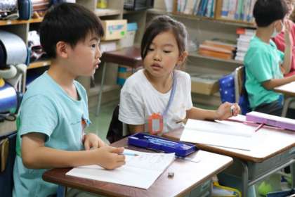 2年生算数の学習の様子です。先生が「友達同士自分のやり方や考えを伝えてみましょう」と言うと、すぐに行動。友達の考えと自分の考えを照らし合わせて、さらに考えを深めることはとても大切な学習です。