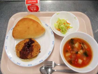 コロッケの大きさは低学年、中学年、高学年で変えています。パンに切れ目が入っていて、野菜ソテーとコロッケをパンにはさんでコロッケバーガーとして食べられるように作っています。揚げたてのコロッケは最高においしいですね。