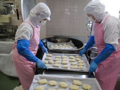 今が旬のじゃがいもを使って、給食室でポテトコロッケを手作りしました。