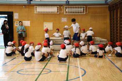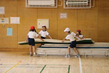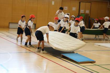 2年生体育の様子です。場を作るところから安全に、協力して活動します。先生が一つ一つ丁寧に確認すると