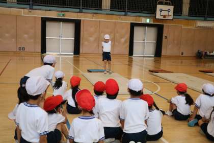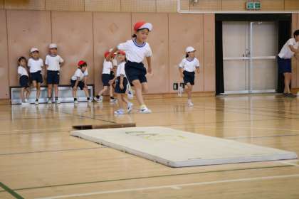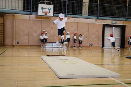 マットの上に置いてあるケンステップという丸いわっかの中にピタッと着地するように繰り返し挑戦です。友達の跳ぶ様子もヒントになります。