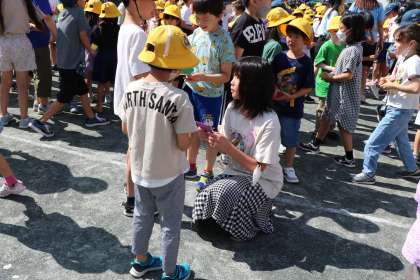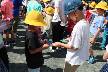 6年生が小さい子たちの方へ一斉に動いてくれるので、下級生が大喜びで自己紹介・名刺交換ができます。目の高さを合わせてくれたり、優しく声をかけたり、本当に下級生に優しい砧の子どもたちです。