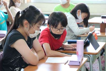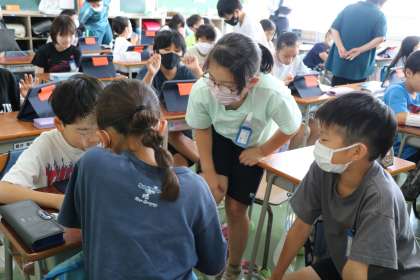 写真は、自分の考えと友達の考えと違いがあるか確認・相談しましょう・・・という時間です。さっと近くの友達と交流する子どもたちです。まだ自分の考えがまとまらない子もいるのですが、全員が学習に向かっている姿に5年生の成長を感じます。