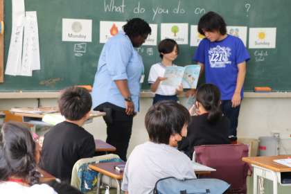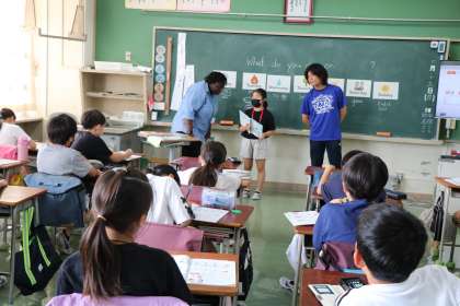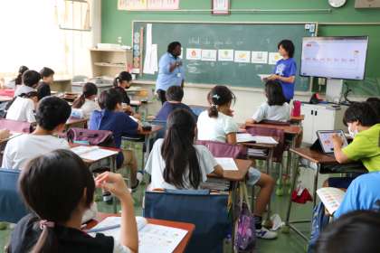 4年生外国語の学習の様子です。○曜日は何をしましたか?友達にインタビューしたことを答えにして、クイズ形式でみんなでそれを当てます。当然英語で出題し答えます。