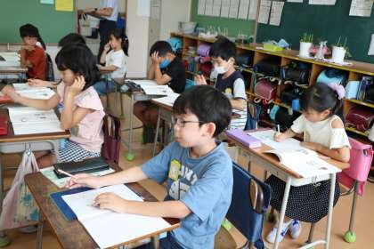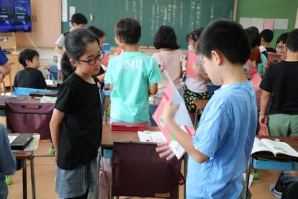 考え考え書いた文章を、自分で練習、その後友だちに伝えに行きます。