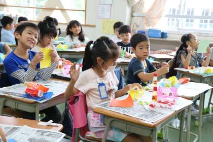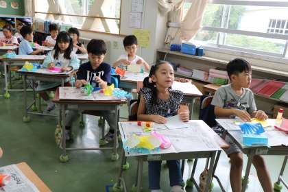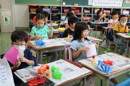 七夕飾りに挑戦です。先生にやり方を説明してもらい、真剣にはさみと紙を動かしています。