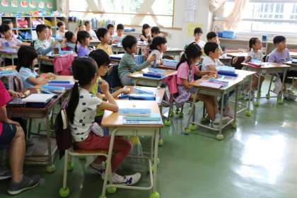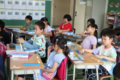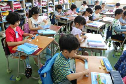 同じく1年生の算数の様子です。ブロックを操作しながら式を立てることを考えています。