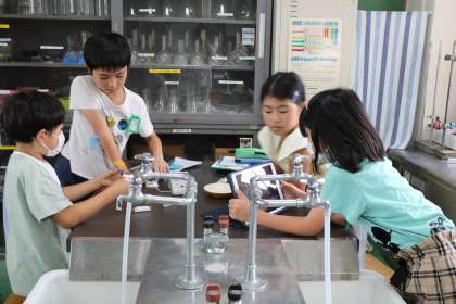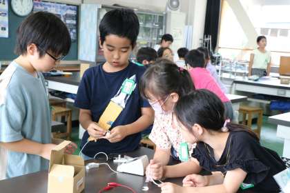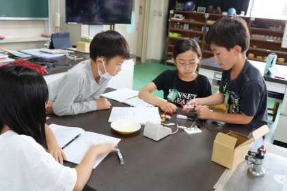 4年生理科の様子です。電気の回路を色々な方法で実際に作ってみてその結果を確かめます。