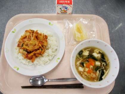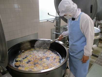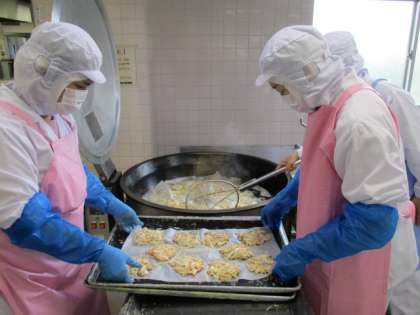かき揚げのかき揚げは給食室でひとつひとつ手作りしました。具材はたまねぎ、にんじん、サツマイモ、大豆、えび、枝豆です。上からかける天つゆも鰹だしをとるところから手作りしています。こどもたちはよく食べていました。