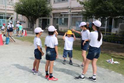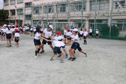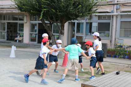 運動委員がリードし、「UFOおに」をしました。手をつないでつくったUFOの外にいるおにが輪の中のリーダーにタッチしたら鬼の勝ちです。リーダーは手をつなぎながら「右!右!」「左!」と輪を作るみんなに指示し、輪(UFO)を動かしながら鬼から逃げます。