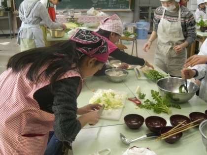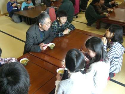 6年生は、地域の方々から戦争体験のお話をお聞きした後、自分たちが作ったすいとんを一緒に食べていただきました。自分たちが育てた大根を食材に使いました。