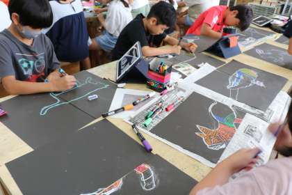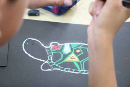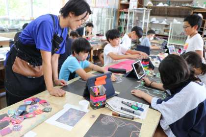 自分でモチーフを決めて、先週練習した技法で描き始めます。色の重なり、細かいドット模様の部分と違う模様の部分を考えながら、作品作りを進めています。
