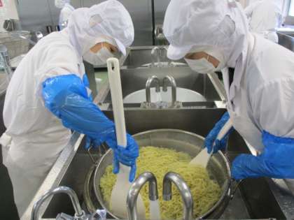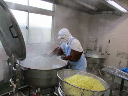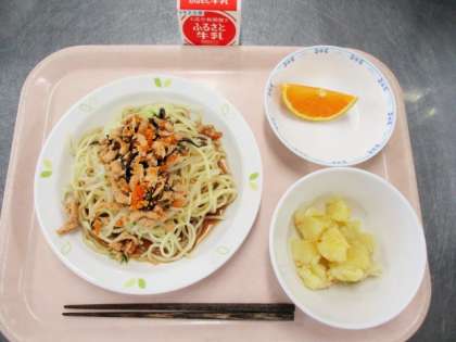 今日の給食は夏メニュー「冷やし中華」です。生中華麺を給食室でゆでて、何度も水をかえて麺を冷やしてつくります。麺の上にゆでたきゅうりともやし、鶏肉とにんじん、キクラゲで作った具、鰹だしをとるところから作ったつゆをかけて完成です。給食室は大忙しのメニューでしたが、こどもたちがとても喜んで食べてくれていたので作りがいがありました。じゃがいものバター焼きもとても人気がありました。
