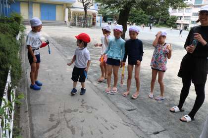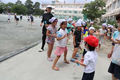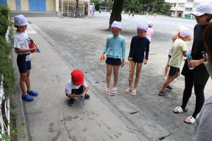 水で絵を描いているお友達に、みんな「すごいね〜」「こういう遊びもいいねえ」と感心です。