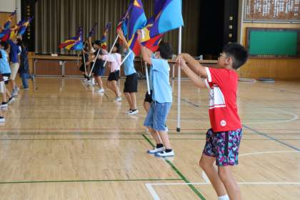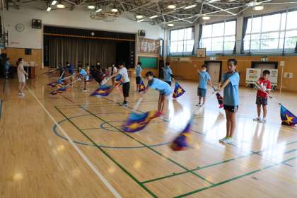 月曜日から始まった6年生鼓笛朝練習の様子です。砧っ子夏祭りでは鼓笛隊がパレードをするので、フラッグ隊も歩きながらの練習も必要です。